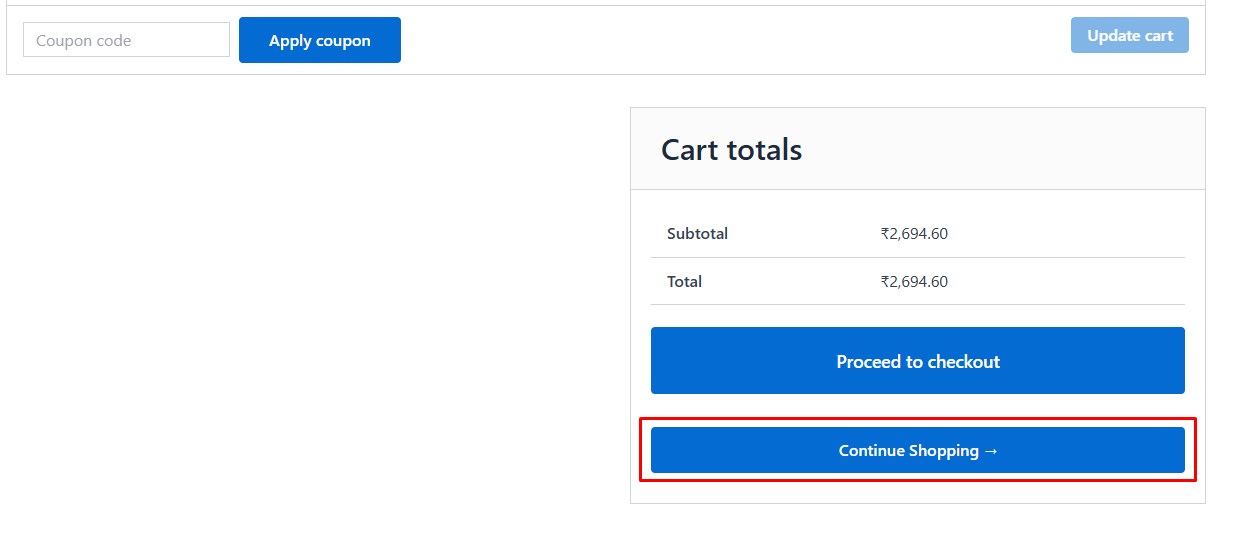 Now, if you’ll go to cart page again you’ll see Continue Shopping which will lead the user to shop page.